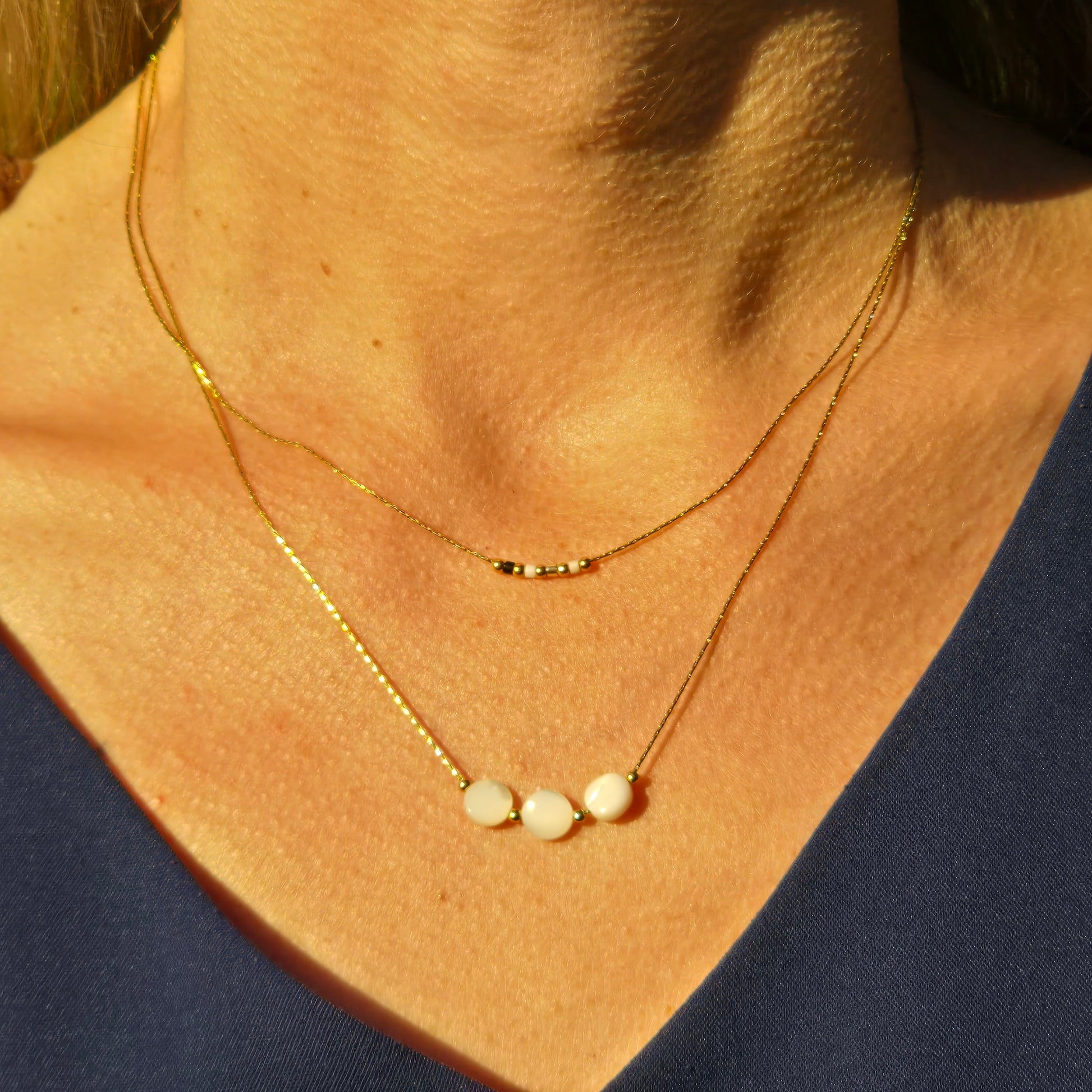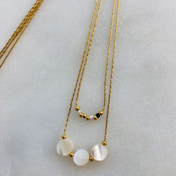 Stylish and modern, the Anna necklace features multiple rows of fine stainless steel chains, Miyuki beads and mother of pearl. Experience the sleek and durable design crafted for effortless wear and lasting elegance.