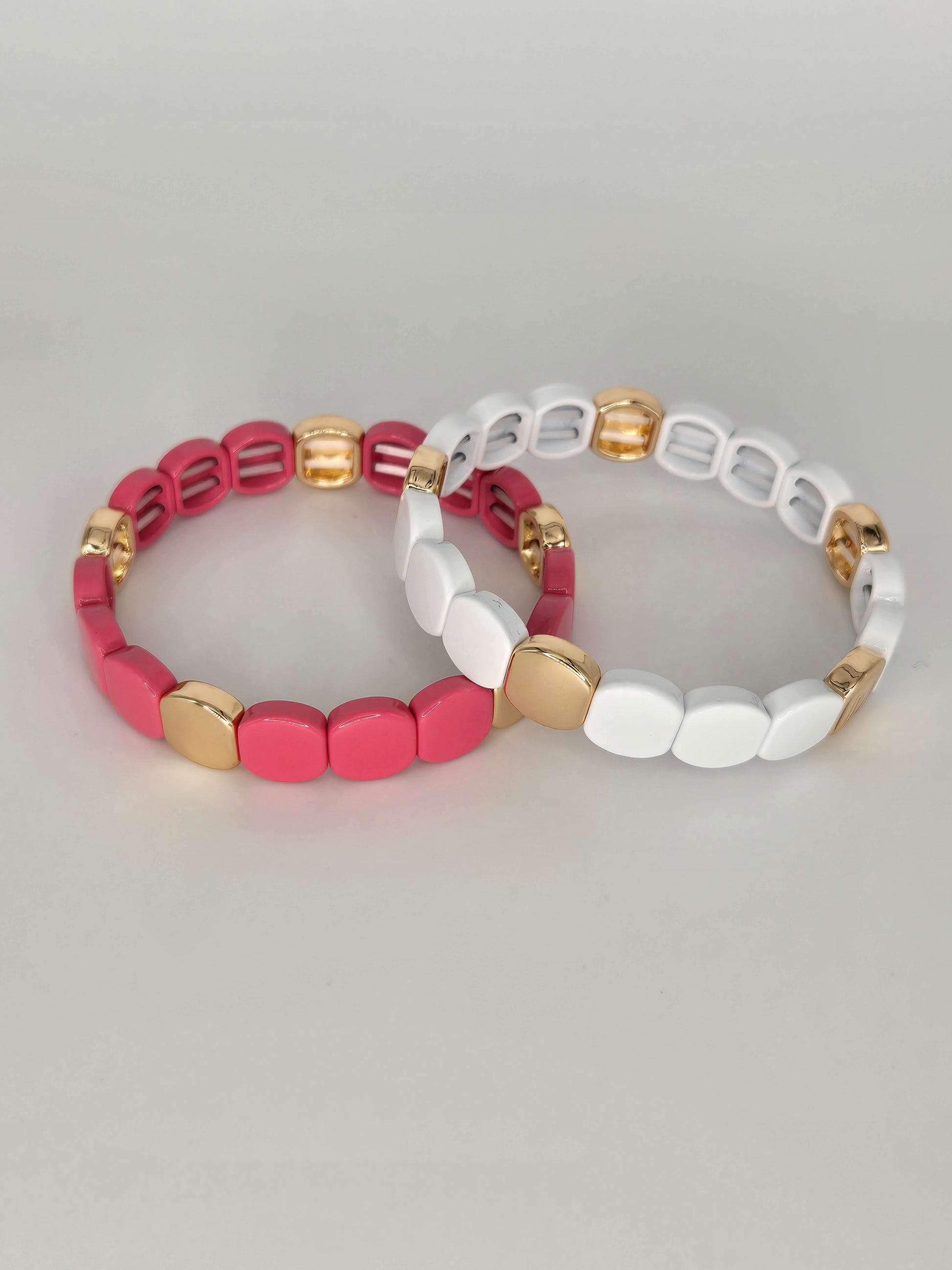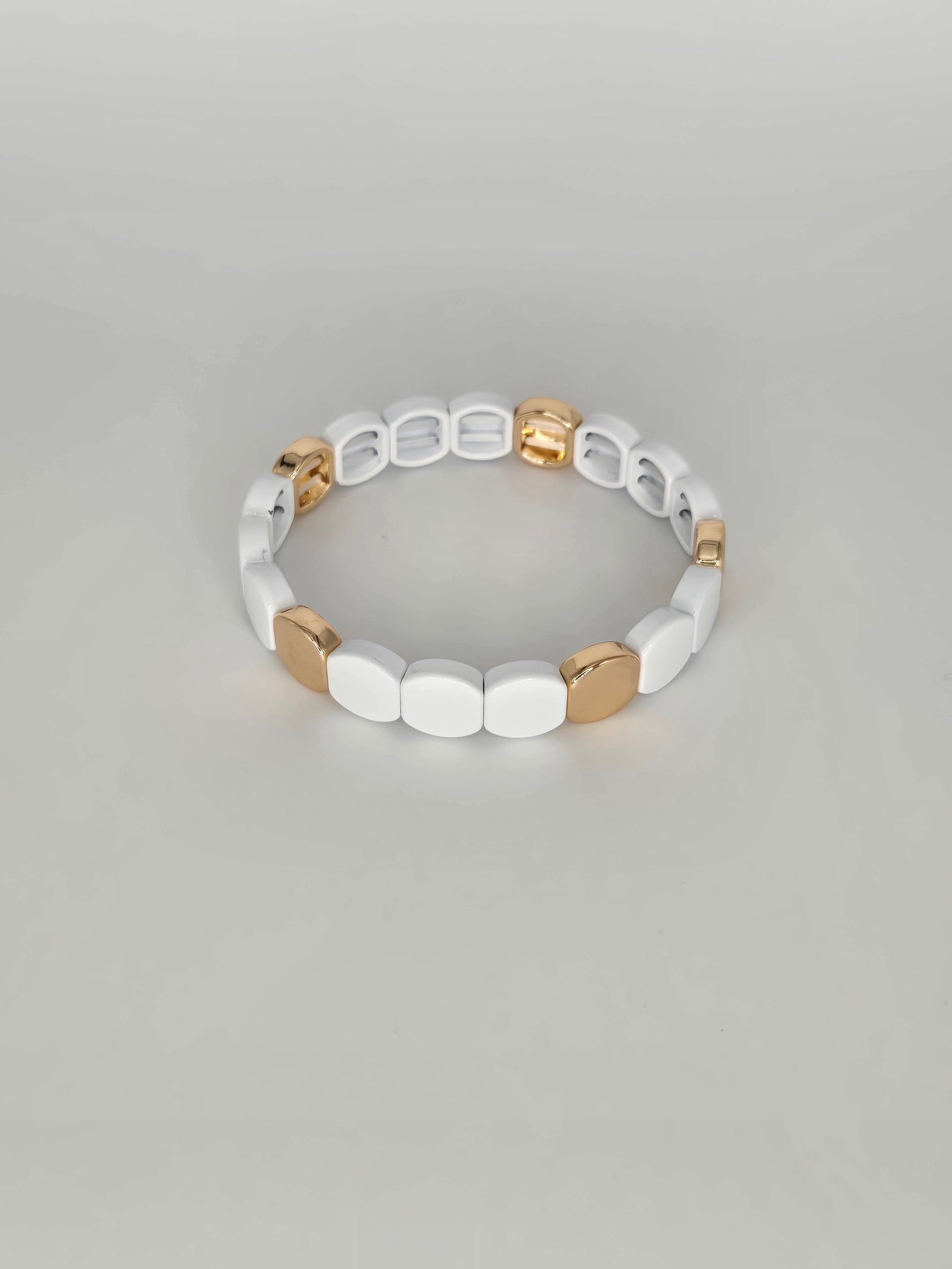 Enhance your everyday look with our timeless bracelet. Made of enameled metal mounted on elastic, this versatile piece can be worn alone or stacked with others for a chic and stylish look. Perfect for any occasion, this bracelet is a must-have for any fashion-forward individual.