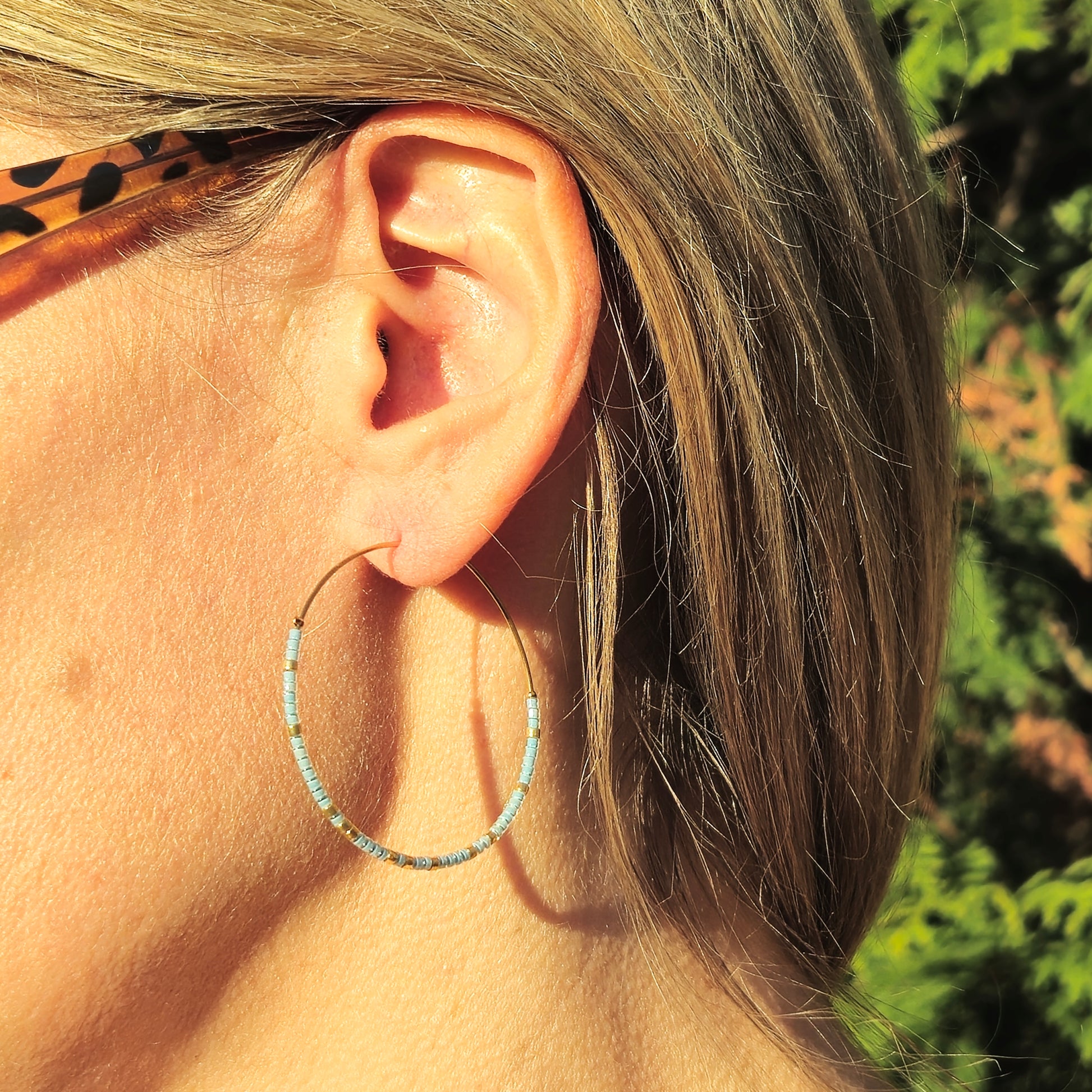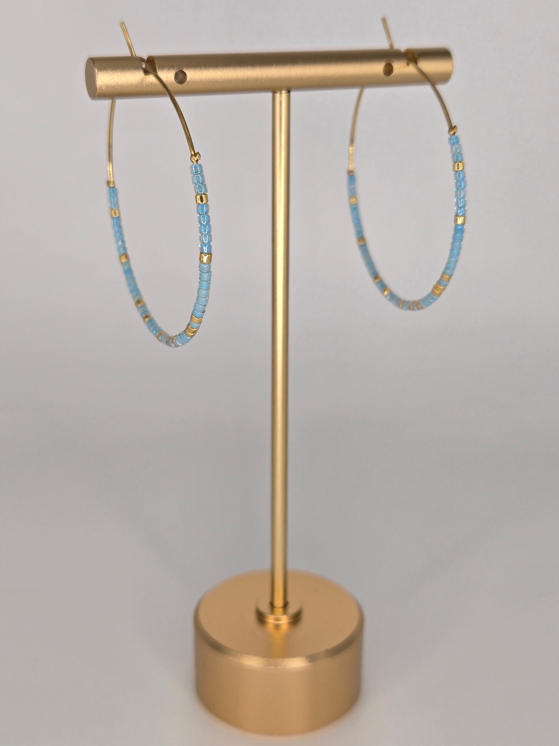 These earring hoops are crafted from stainless steel and adorned with blue and gold Miyuki Japanese beads. They are lightweight and modern, making them easy to combine with any outfit. Add a touch of color to your ensemble with these fashionable earrings.