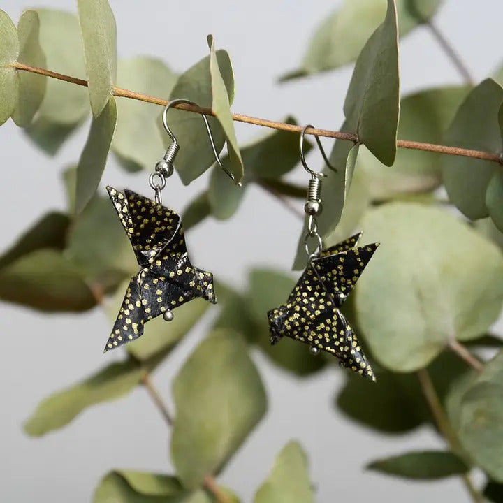 Add a touch of delicate elegance to your outfit with our Earrings couple of black and gold doves. These unique earrings feature intricately designed Japanese paper doves, suspended from silver-plated brass hooks. Handcrafted with precision origami techniques. Elevate your style with these beautiful, nature-inspired earrings.