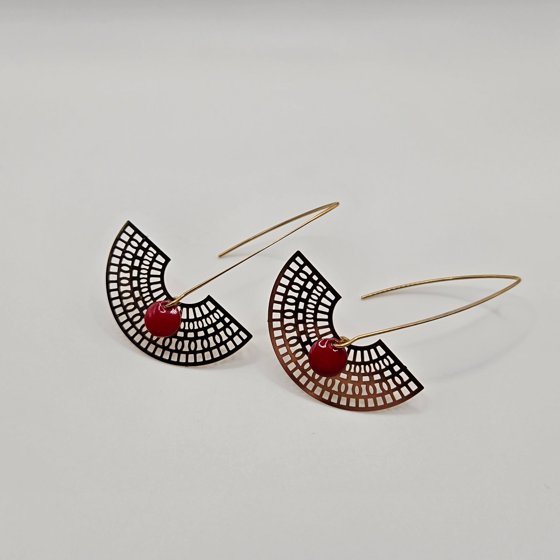 Experience elegance and style with our "The Dreamer" earrings. Featuring golden brass half-moons and red enameled sequins, these graphic earrings are both durable and stunning. The stainless-steel hooks ensure a secure and comfortable fit. Elevate any outfit with these versatile and expertly crafted earrings.