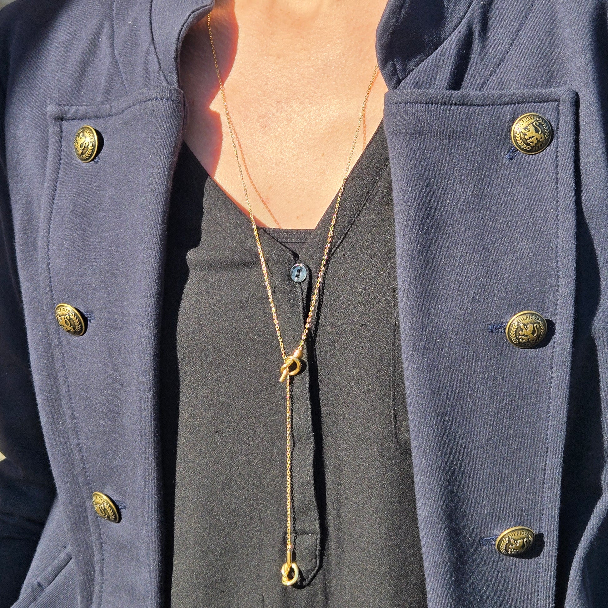 Crafted with stainless steel, this long necklace combine elegance and finesse. The length makes it a versatile accessory for any outfit, while the double loops add a unique touch. Elevate your style with this fine piece.