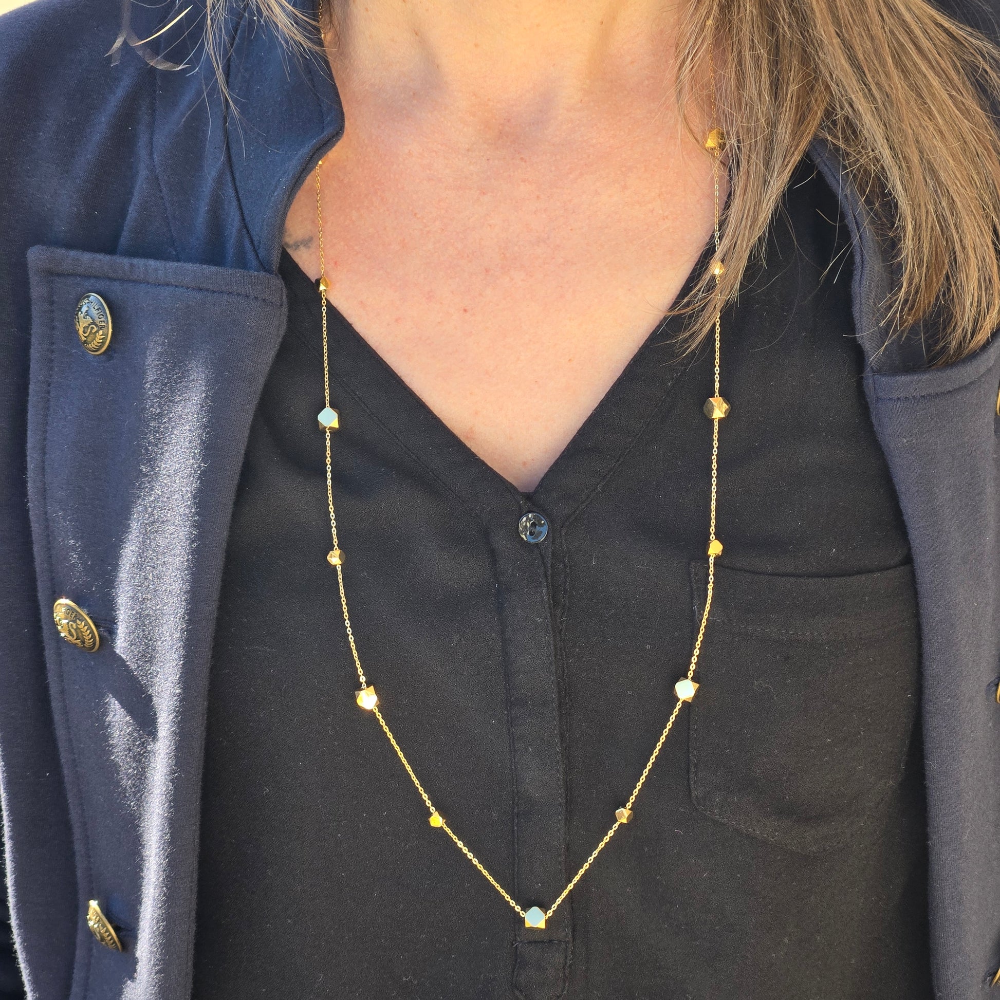This long necklace boasts a modern and polished look with its faceted cubes, crafted in durable stainless steel. Elevate your style with this sleek and chic accessory that adds a touch of sophistication to any outfit.