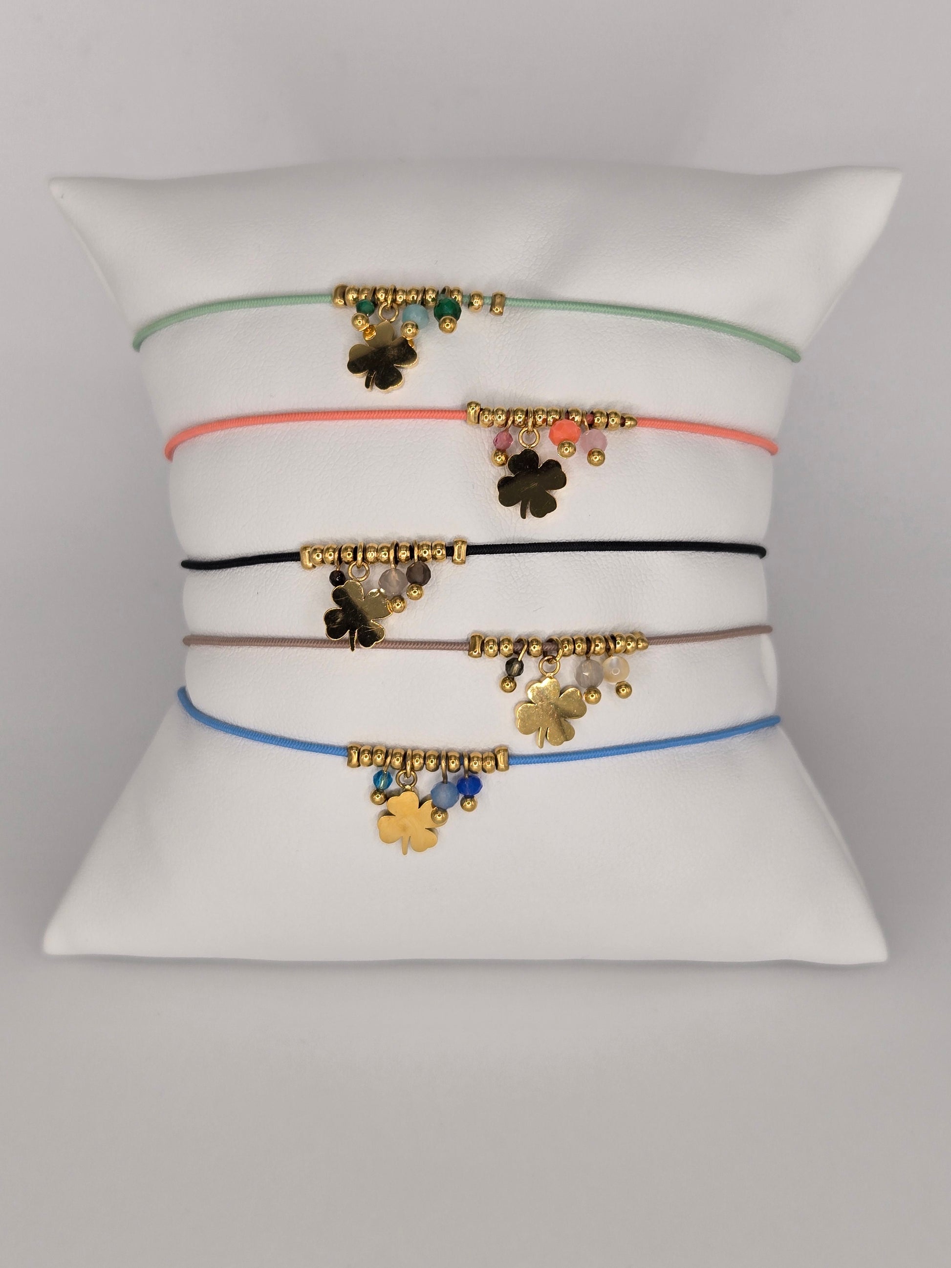 Expertly crafted with stainless materials, this elegant beige elastic bracelet features a clover for added charm and symbolism. Its unique design allows for easy combination with any outfit, making it the perfect versatile accessory for any occasion.