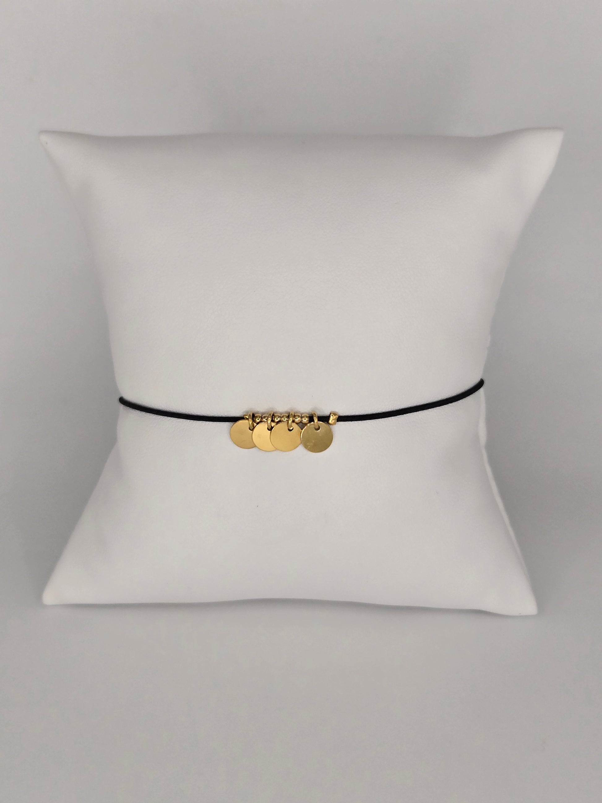This black elastic bracelet with gilded stainless charms is perfect for adding a touch of love and charm to any outfit. The sliding knots make it easy to adjust for a comfortable fit, while the simple design allows for easy combination with other accessories. A must-have.