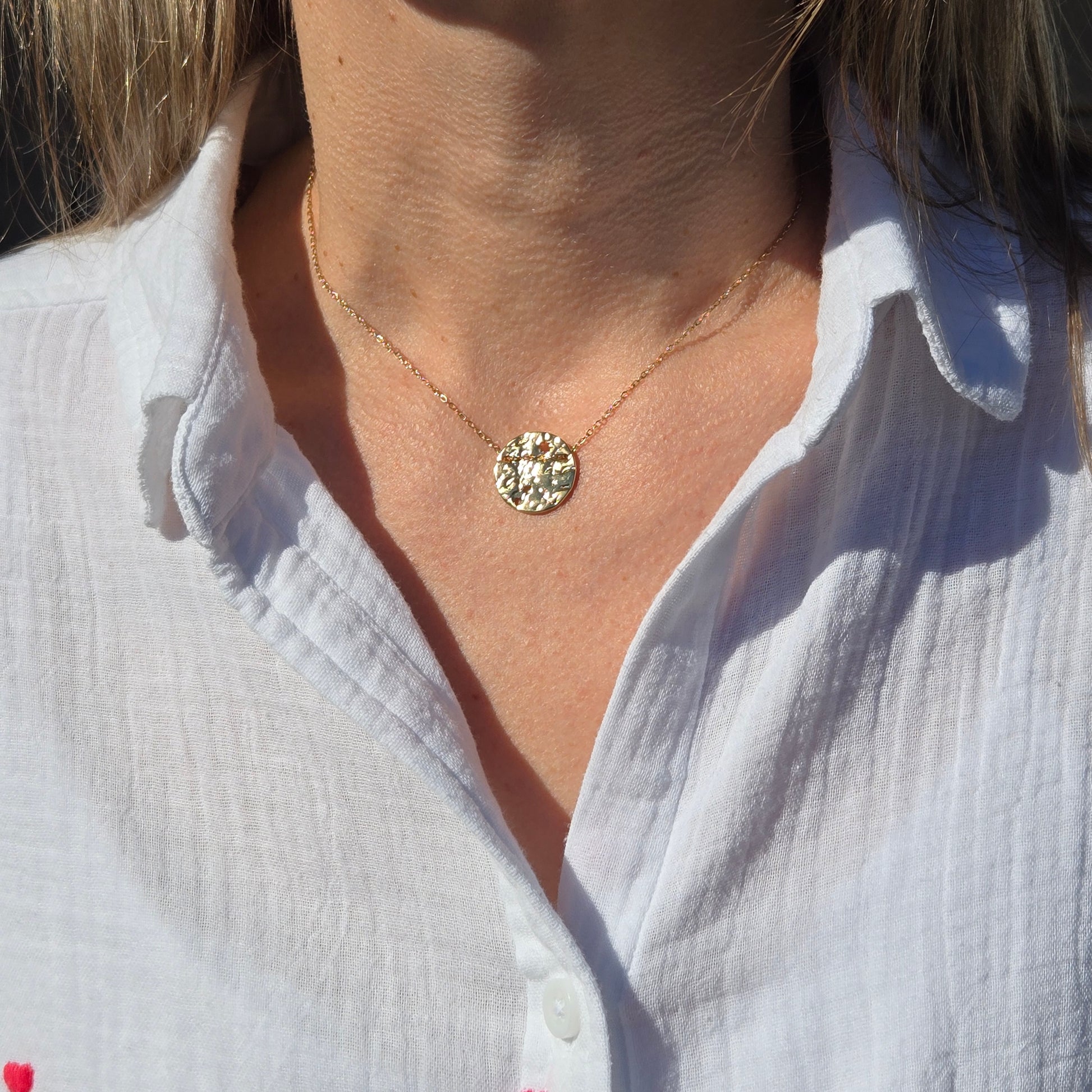Crafted with stainless steel, this necklace with a hammered round pendant will fit perfectly to any out fit.